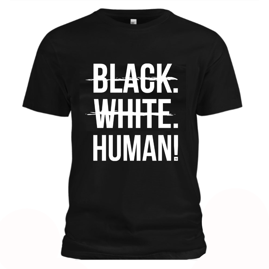 Solid color 100% cotton jersey tee featuring the "Black, White, HUMAN" graphic on the front.